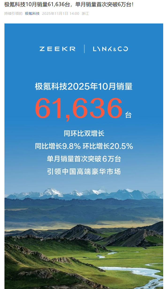 其中,极氪品牌 10 月销量 21423 台,焕新极氪 001 上市锁单量快速破万;领克品牌 10 月销量 40213 台,领克 900 上市 6 个月托福量冲破 4 万台,全新领克 08 EM-P 上市 30 天整车下线超万台。